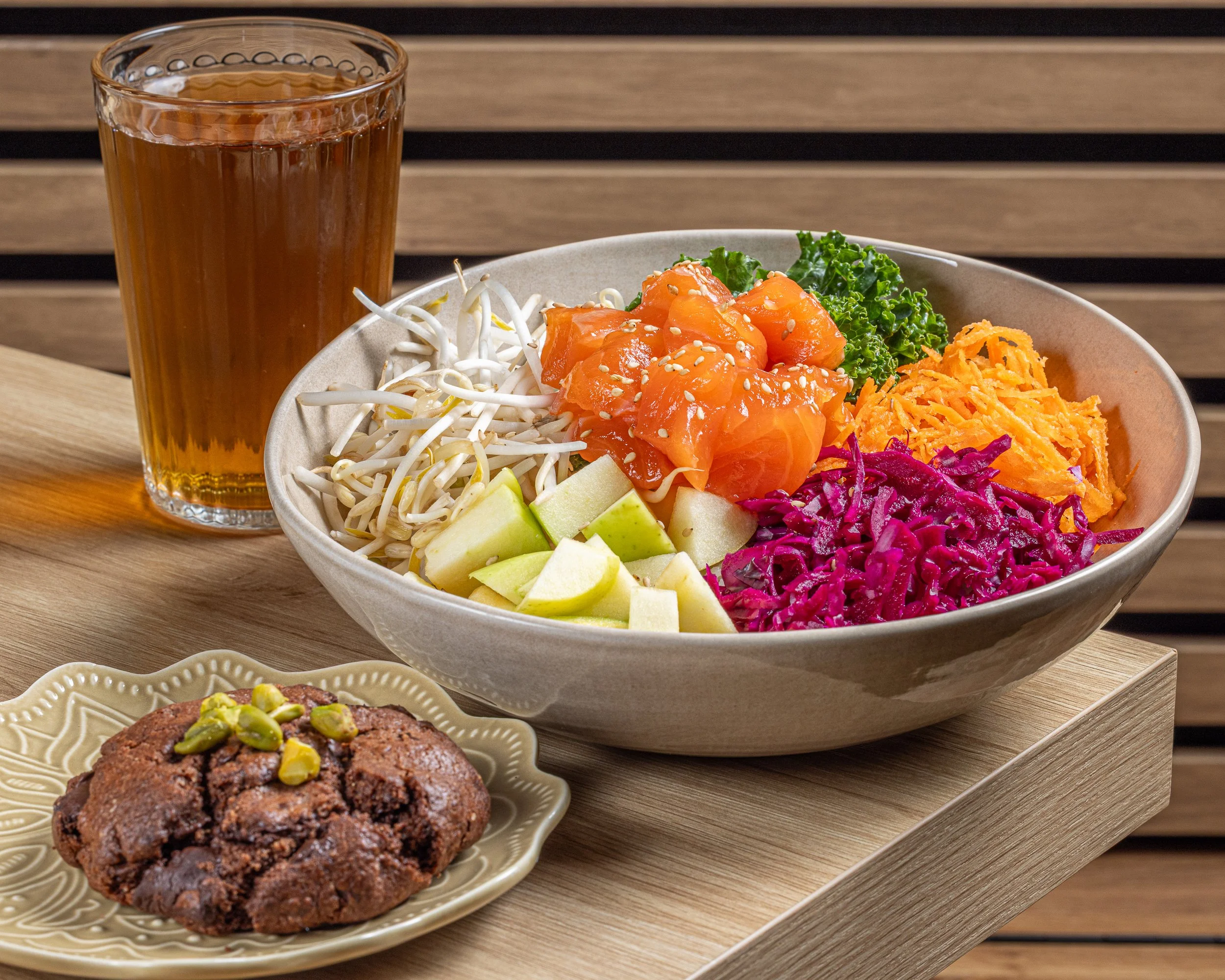 Base de riz sushi, saumon, carotte, chou rouge, pousse de soja, concombre, pomme et graines de sésames.